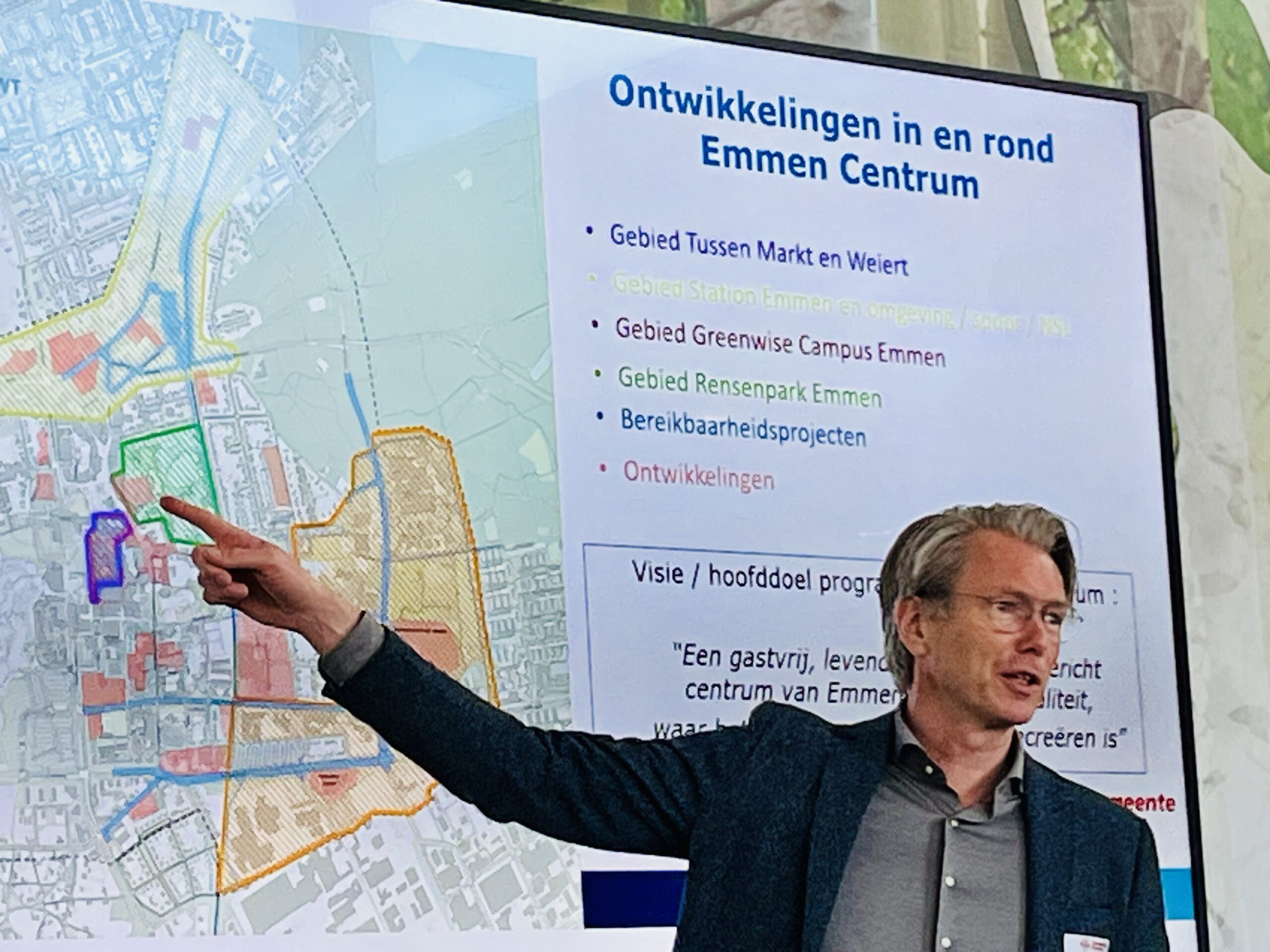 Erwin Kuipers, programmamanager Emmen-Centrum, vertelde vervolgens over de ambities en ontwikkelingen in Emmen. De stad werkt aan meer woningen, betere bereikbaarheid, een sterker voorzieningenniveau en een aantrekkelijker centrum. In het gebied tussen Markt en Weiert vinden de meest belangrijke ingrepen plaats. Thijs Klompmaker, projectmanager, ging tijdens zijn presentatie dieper in op specifiek dit gebied: “Ons centrum is langgerekt. Het Marktplein bestaat uit zo’n 250 meter tussen twee losse centrumgebieden. Dat zorgt voor een onderbreking in de routing voor het winkelend publiek. Daarnaast kampen we met veel leegstand in dit gebied. De geplande ingrepen moeten ons centrum minder kwetsbaar maken voor leegloop én minder afhankelijk maken van retail alleen.”
